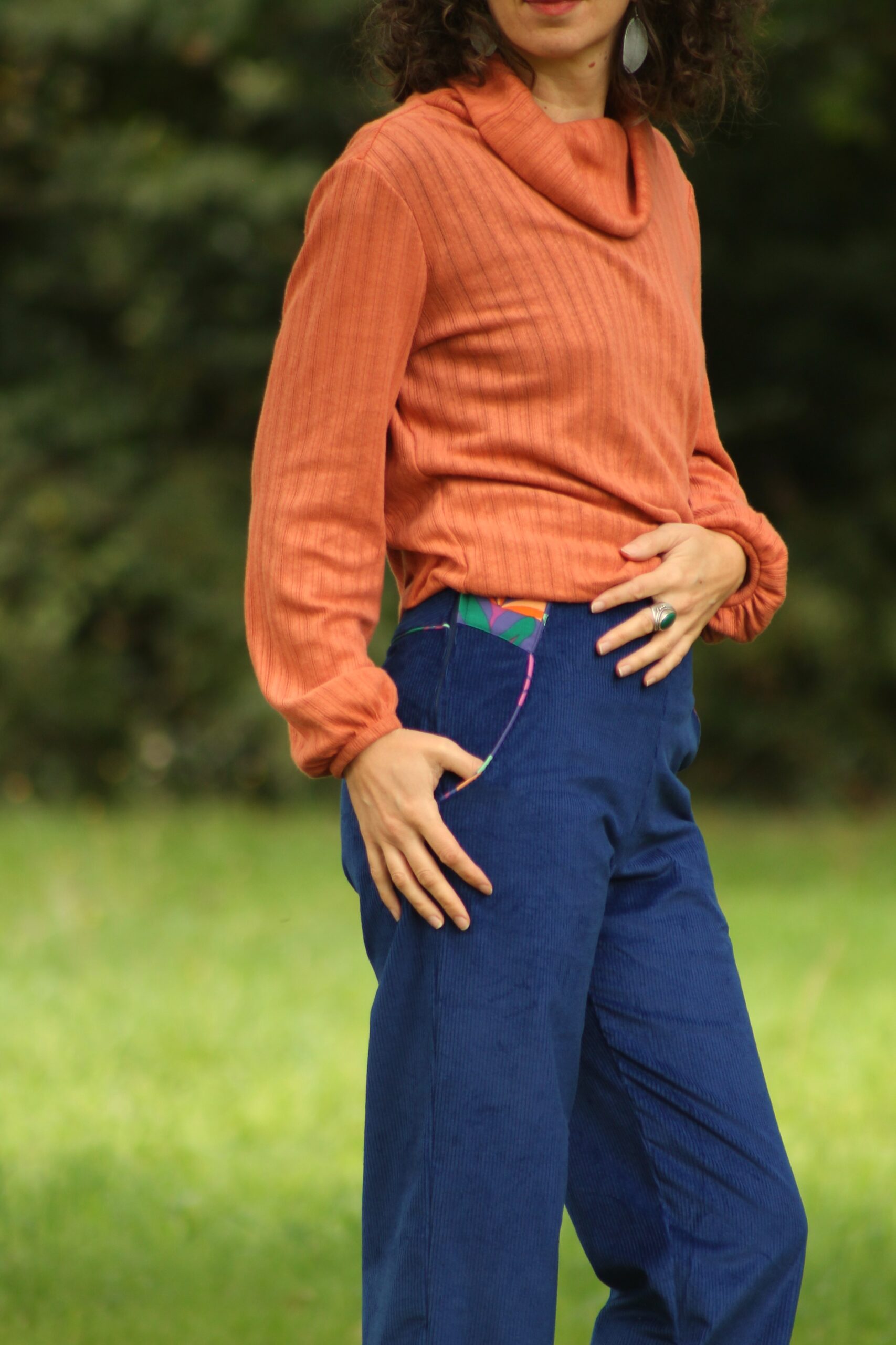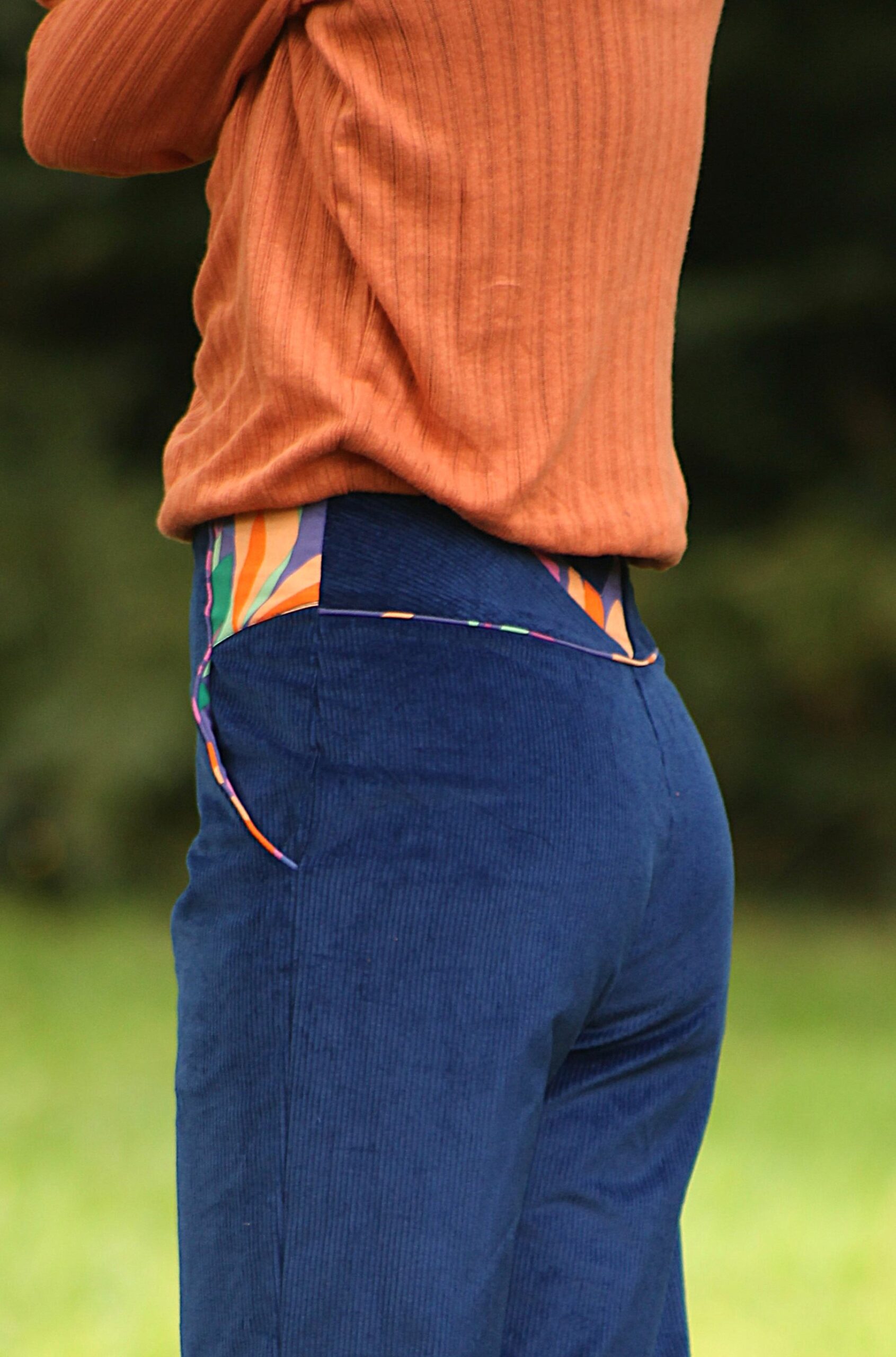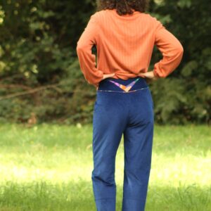 Les touches de tissu coloré assorti donnent du pep’s à l’ensemble du pantalon.