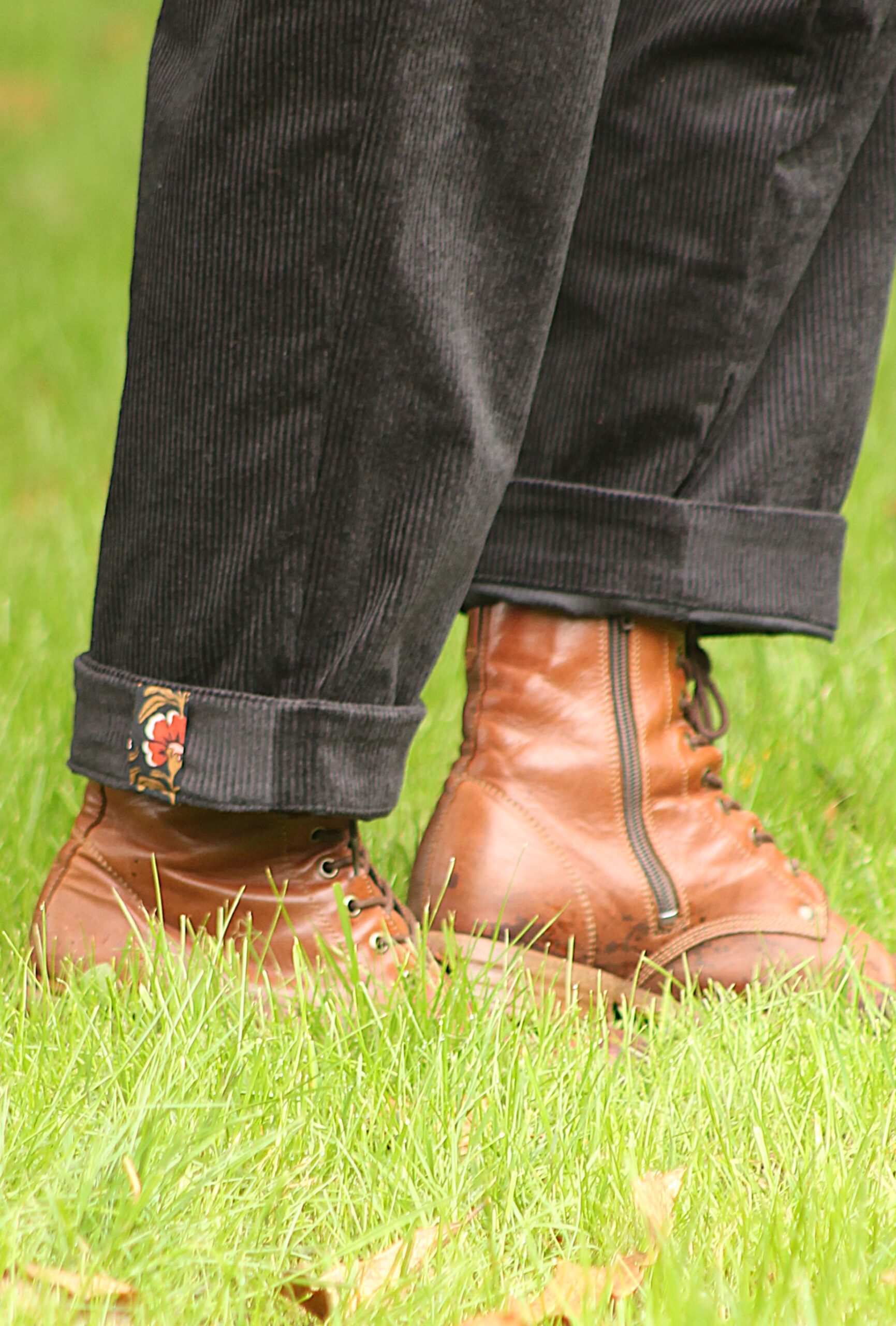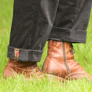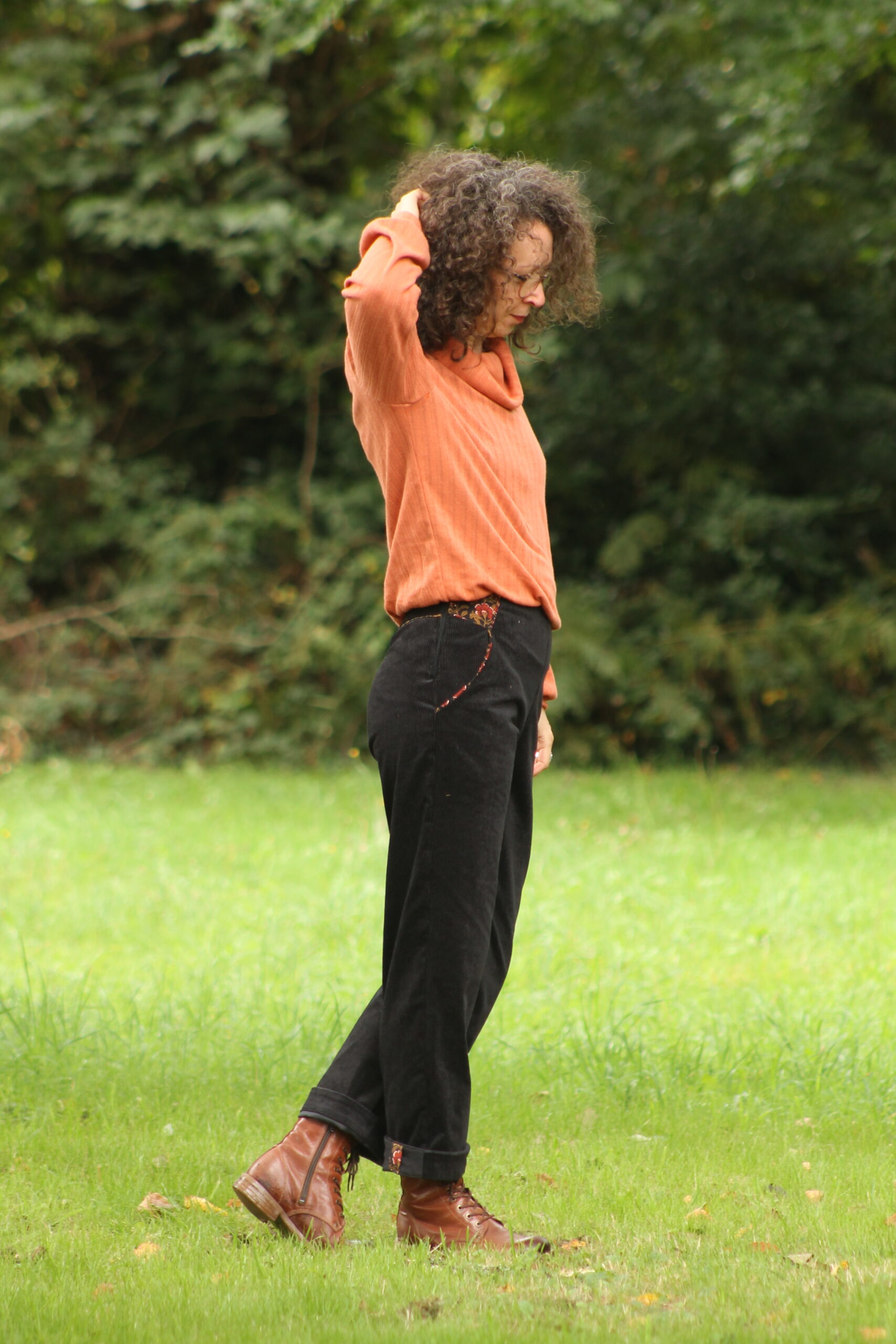 Une coupe large au bassin qui épouse la belle rondeur de la partie supérieure de notre fessier et un revers qui marque joliment le bas du pantalon.