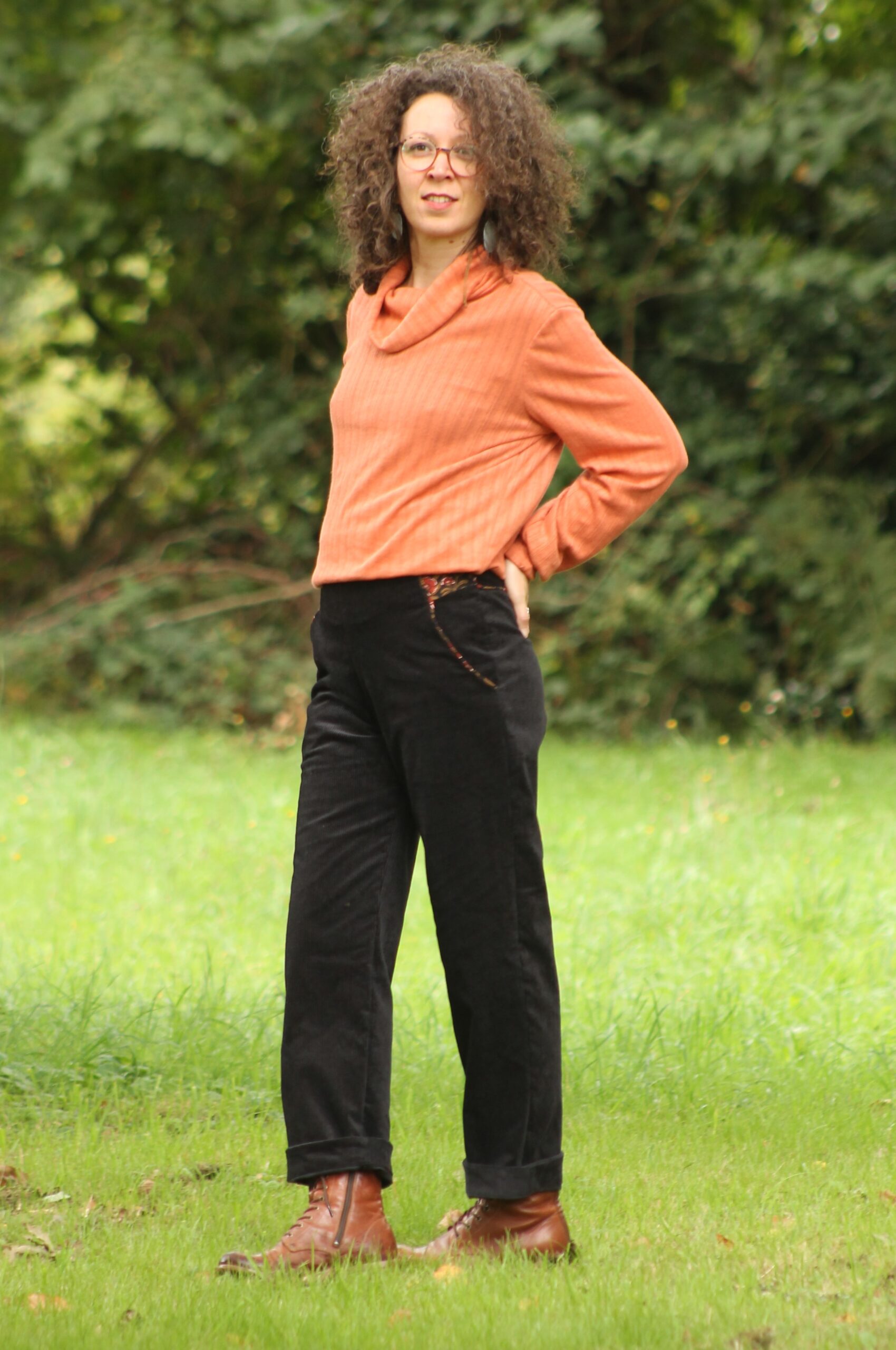 Les touches de tissu coloré assorti donnent du pep’s à l’ensemble du pantalon.