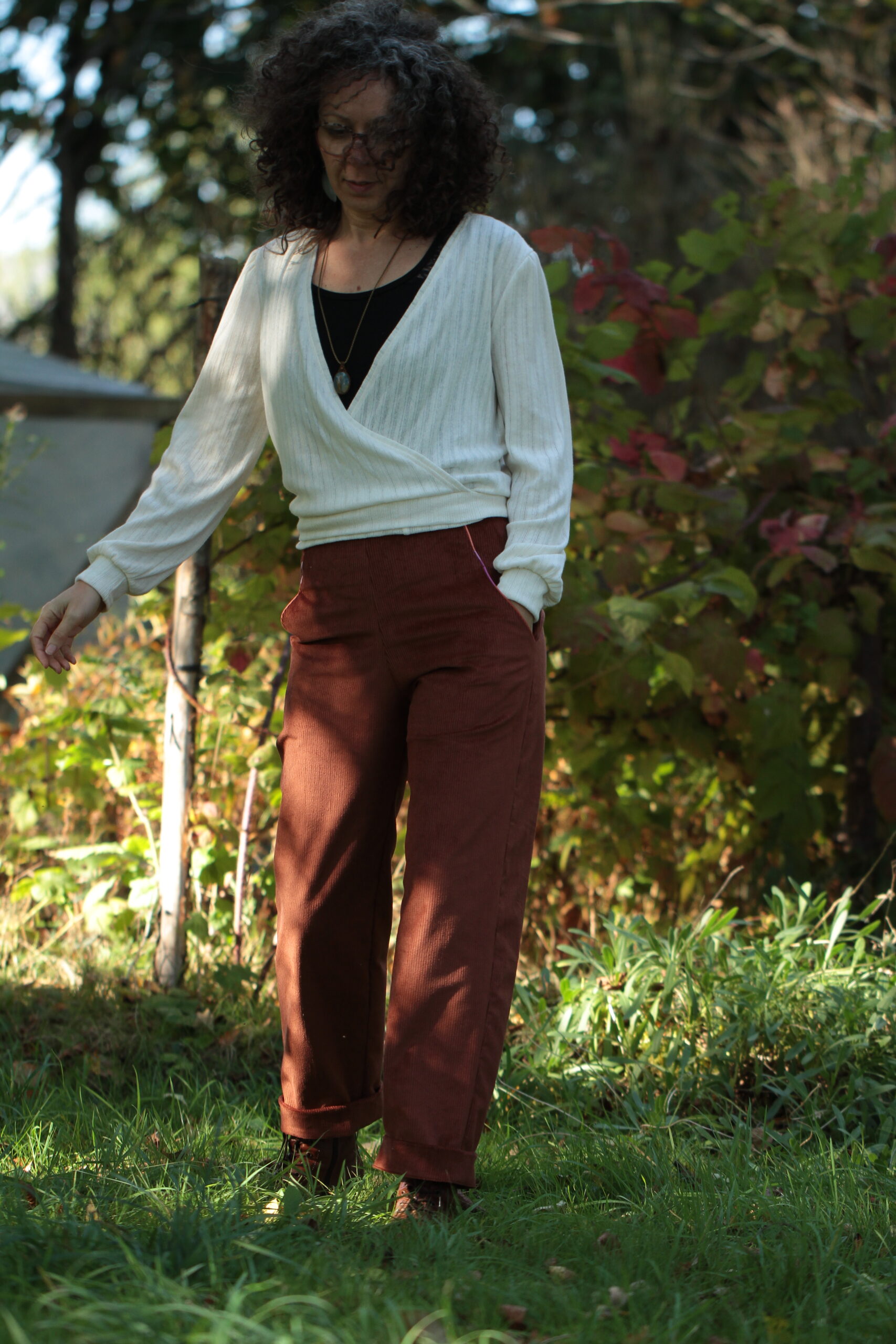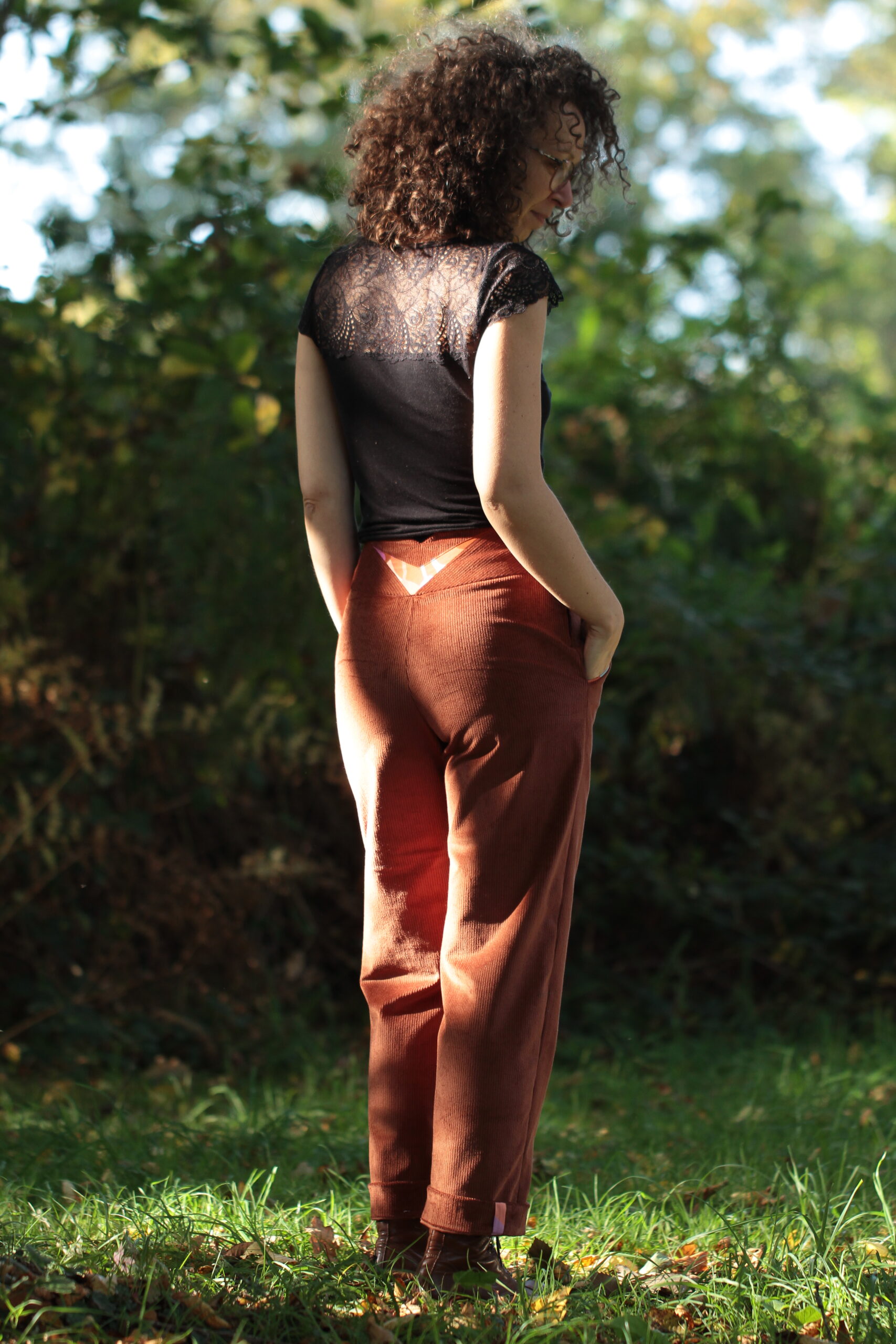Une coupe large au bassin qui épouse la belle rondeur de la partie supérieure de notre fessier et un revers qui marque joliment le bas du pantalon.