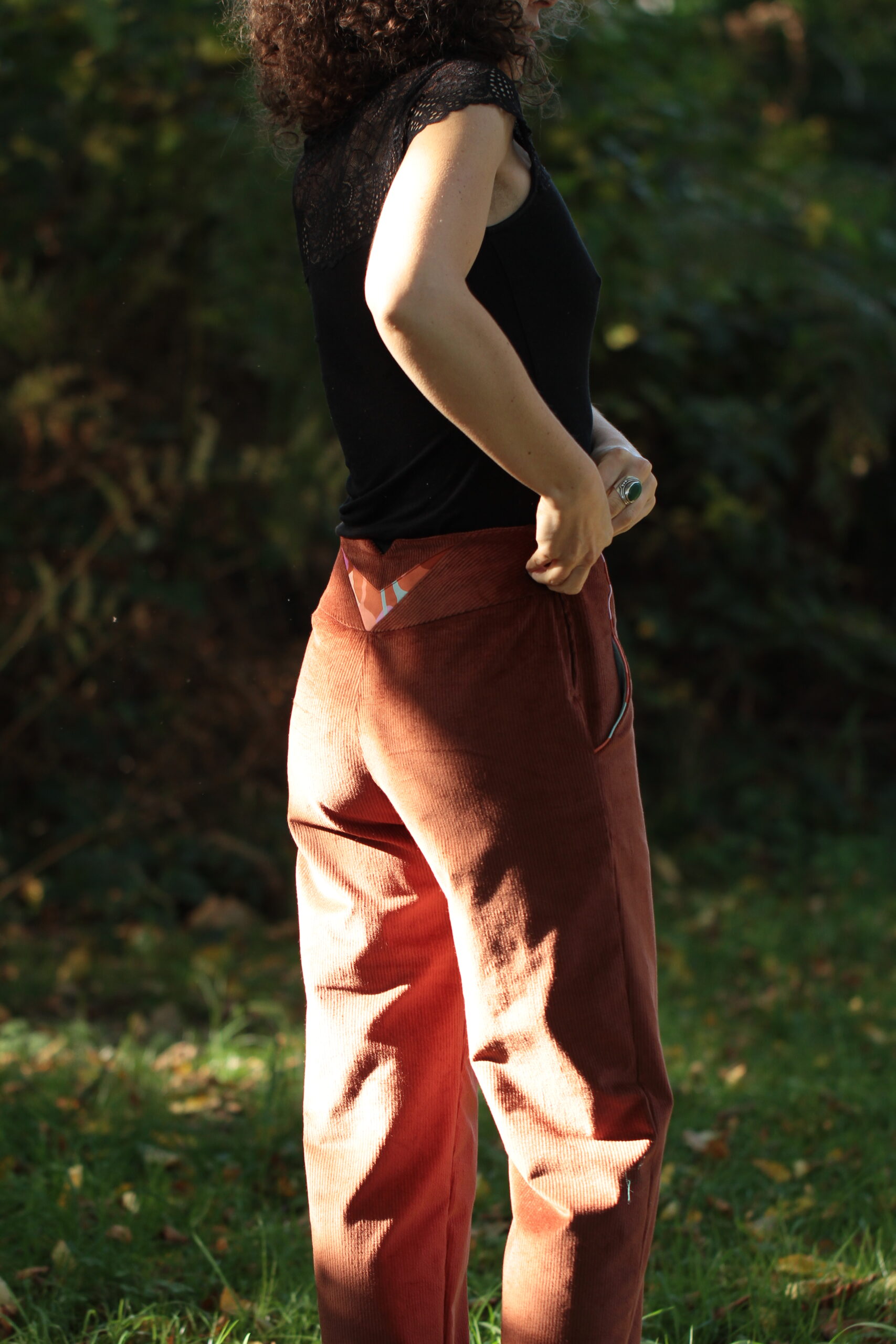 Les touches de tissu coloré assorti donnent du pep’s à l’ensemble du pantalon.